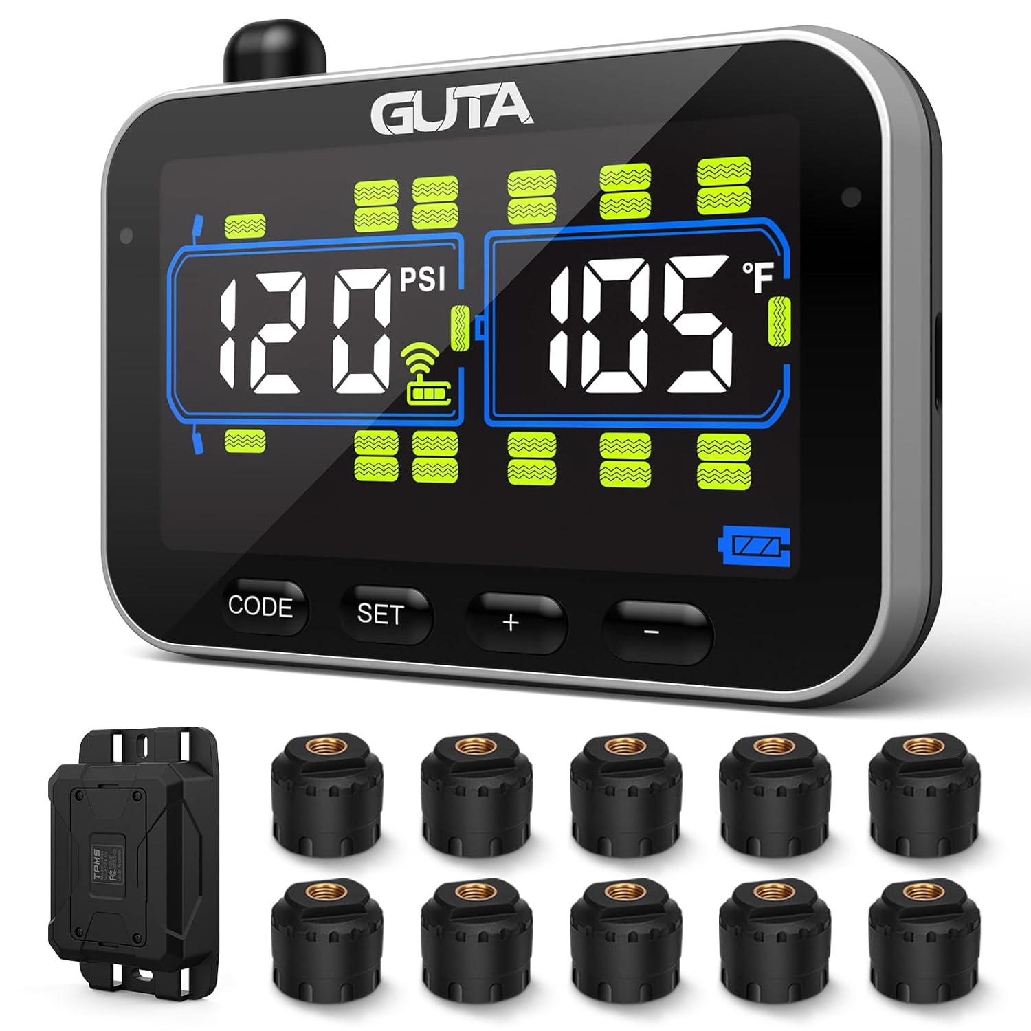 GUTA Trailer Tire Pressure Monitoring System, RV Tire Pressure Monitor with 10 Sensors, 6 Alert Modes, Signal Booster, Large Color Display, Long Sensing Distance, 0-188PSI TPMS…