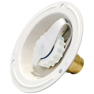 This recessed water inlet is made of metal with a powder coat finish. It has a garden hose swivel fitting with a gripper to make it easier to screw your campground pressure hose to the inlet. Includes a press-on dust cap.